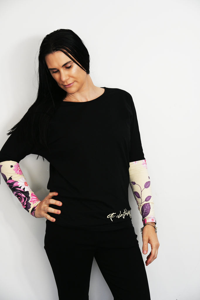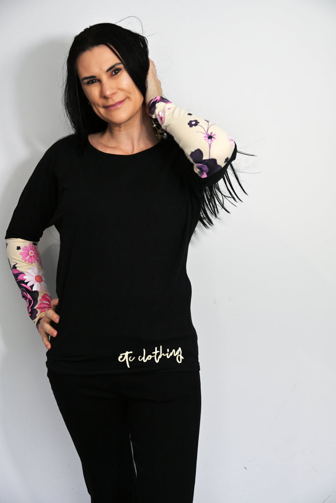 Embrace effortless style with the Floral Power Hours Batwing Tee. Crafted from a soft cotton blend with a touch of spandex, this black batwing top offers comfort and a flattering fit. The playful floral sleeves add a splash of charm, making it perfect for turning heads wherever you go.